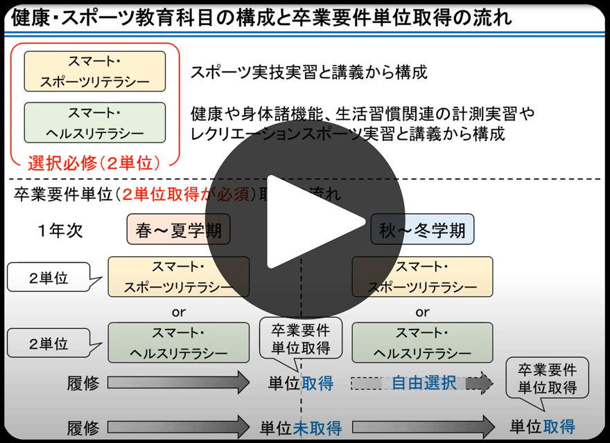 - 春~夏学期で、スマート・スポーツリテラシーまたはスマート・ヘルスリテラシーのいずれかを必ず履修する必要があります。
