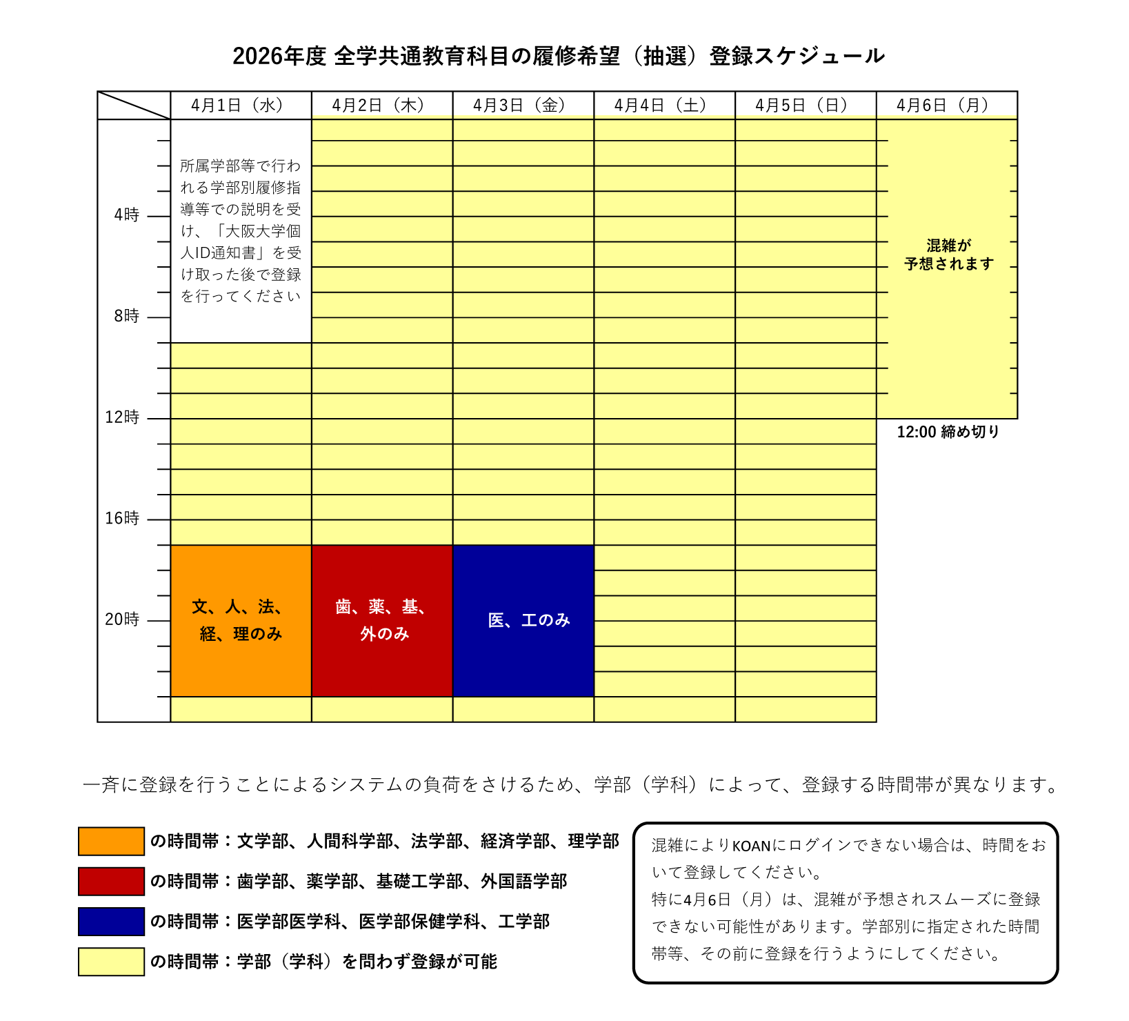 全学共通教育科目の履修希望(抽選)登録期間において、一斉に登録を行うことによるシステムの負荷をさけるため、以下の通り、学部(学科)によって、登録する時間帯が異なります。混雑によりKOANにログインできない場合は時間をおいて登録してください。ご協力をお願いいたします。