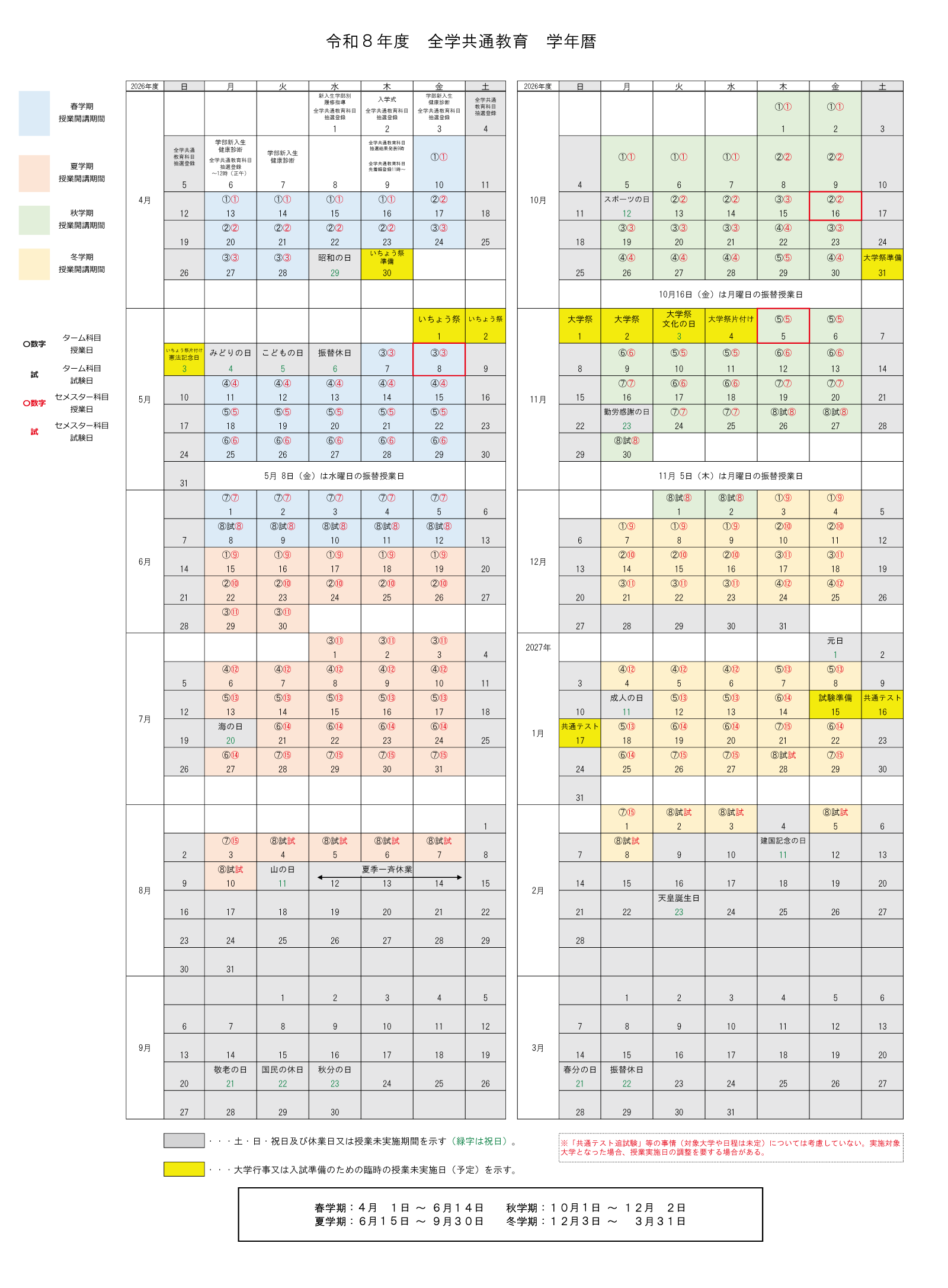 令和8年度 授業カレンダー(共通教育)